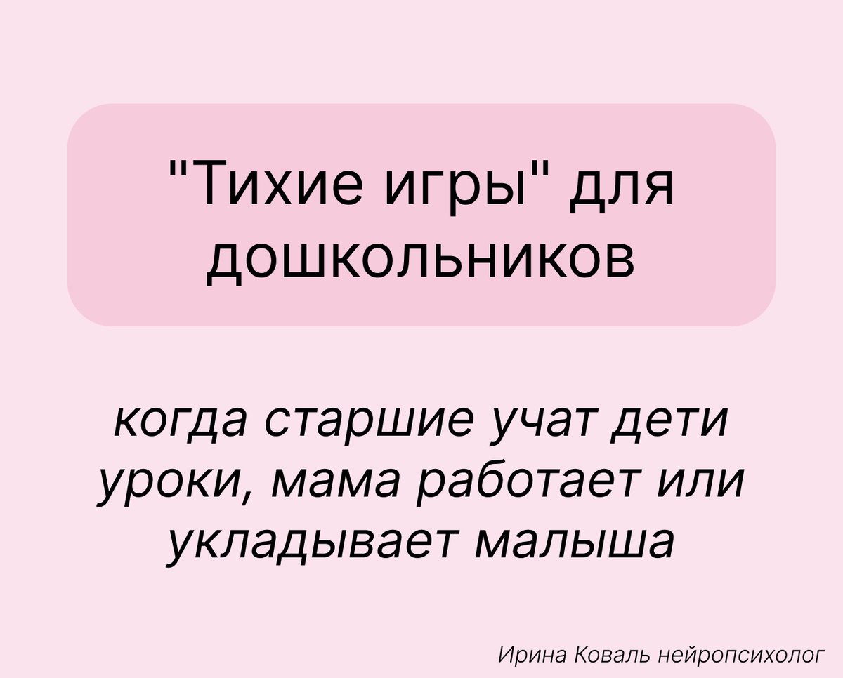 ✔️ Сортировщик сокровищ Выдаём коробку со смешанной мелочью: пуговицы разного размера/цвета, крупные бусины, макароны-перья, ракушки. Задание: разложить по мисочкам по любому признаку - цвет, форма, размер. 👍 Тренирует внимание, мелкую моторику, навык классификации. Можно усложнять: "разложи так, как считаешь нужным, а потом объясни принцип". ✔️ Бумажный конструктор Заранее нарезаем полоски бумаги разной длины и ширины. Задание: склеить из них клеем-карандашом самый высокий/длинный/красивый мост, лабиринт, геометрическую фигуру. 👍 Развивает пространственное мышление, креативность, работа почти бесшумная. ✔️ Тихая охота По квартире/комнате расклеиваем на уровне глаз ребёнка 10-15 маленьких стикеров с рисунками - звездочка, котик, машинка. Выдаём "охотничий список" - такой же листик с картинками и карандаш. Нужно найти все и отмечать. 👍 Развивает внимание, умение следовать инструкции. ✔️ Крупа-рисовалка Насыпьте на поднос или в неглубокую миску манку, мелкую соль или песок, слой приме
