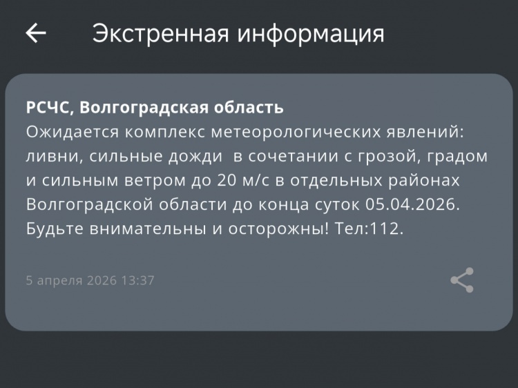 В Волгоградской области до конца суток 5 апреля ожидаются сложные метеорологические явления. Предупреждение распространили РСЧС около 14:00. По данным синоптиков, в ближайшее время ожидаются ливни с грозой, ветром до 20 метров в секунду и градом. Жителей региона призывают быть внимательными и осторожными. Рекомендуется скорректировать планы, одеваться по погоде, позаботиться о безопасности имущества. Отметим: по данным метеорологического портала Gismeteo, в Волжском в течение дня ожидается температура воздуха до +20 градусов и небольшой дождь при сильном ветре.