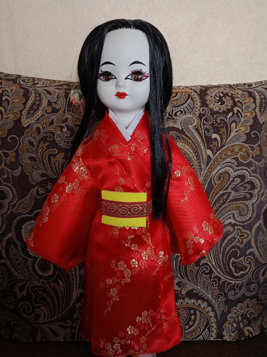 Ура, мой канал набрал 10 подписчиков и наконец-то стал видимым! Надеюсь, что со временем их станет еще больше, а пока в честь этого радостного события хочу познакомить вас с моей японской коллекцией. В прошлый раз я рассказывала о своем небольшом цыганском таборе. Почитать о куклах-цыганках можно вот здесь: А теперь наступила очередь кукол-японок. 1. Японка Ивановской фабрики (наши дни) Самый мой любимый экземпляр - это кукла современной Ивановской фабрики. У этой куклы шикарные волосы и яркий, хотя и незамысловатый костюм. Кимоно достаточно простое, я бы даже сказала - традиционное. Пояс, который называется оби, представлен широкой тесьмой, которая сзади (на фото под волосами не видно) застегивается на липучку. Необычно выполнен мейк, на этом все достоинства куклы заканчиваются. Но, повторюсь, она бесконечна мила и дорога моему сердцу. 2. Японка Ивановской фабрики (СССР) А вот это самый ценный экземпляр моей японской коллекции - кукла Ивановской фабрики советского периода. Высота