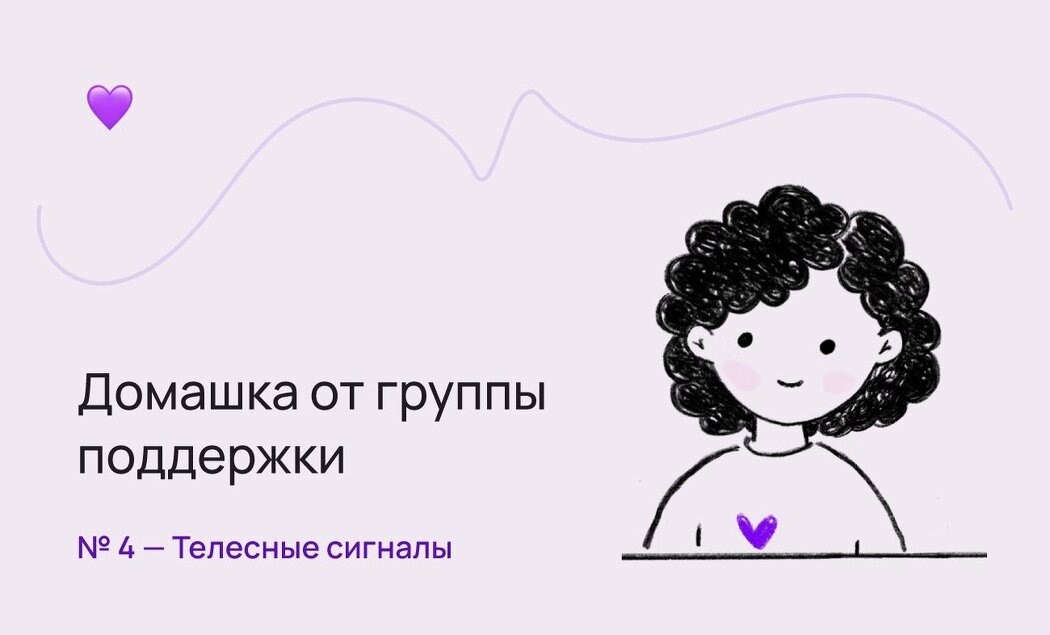 📓Телесные сигналы ДЗ №4 Эта статья из канала про РПП, который мы ведём с коллегой. Каждую неделю мы проводим группу равной поддержки. На одной из встреч мы касались разных трудностей и вопросов, обсуждали практики дыхания и плавно подошли к теме телесности, с которой и будет связано это задание. 📝 Что делать? Порой мы перестаём замечать или отмахиваемся от базовых телесных сигналов. Мы терпим дискомфорт, не придаём ему значения. Задача — в течение дня несколько раз (не обязательно постоянно) постараться заметить, что происходит в теле, и не игнорируем ли мы такие вещи как холод, боль, неудобство, жажду и так далее. Примеры: Сижу скрючившись? Лежу неудобно? Что-то затекло? Стиснуты челюсти? Подняты плечи к ушам? Сжаты кулаки? Тесная резинка на поясе? Давит ремешок часов? Чешется спина? Сползают очки? Устали глаза от экрана? Холодно? Жарко? Душно? Стягивает кожу? Хочется умыться? Хочу в туалет (но откладываю)? Хочу пить? Глаза слипаются (но продолжаю сидеть)? 🔸 Ключевые рекомендации В