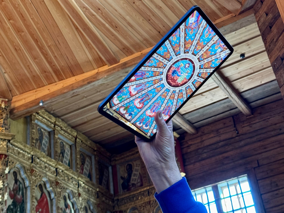 Это слова нашего экскурсовода, показывающего визуализацию на планшете. Мы стоим под куполом Преображенской церкви в Кижах.