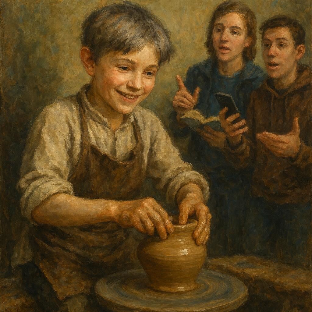 — Вы опять здесь? Всё смотрите, смотрите... — Мы не просто смотрим. Мы ждём продолжения. — Продолжения? Так оно будет. Я вот учусь делать горшки. Видите? Руки уже не так дрожат. — Нам нравится. Но ты должен быть не просто гончаром. Брось эту глину, тебе не место за гончарным кругом. У тебя дар, ты можешь быть великим чернокнижником. — А если жить безо всякого колдовства? Вот я делаю кринку. Видали, какая она была? Комок глины, и всё. А теперь ровненькая, гладкая, красивая. Вот просохнет, обожжём её с дядей Афанасием. — Но нам, читателям, хочется чуда! — Разве вы не видите чудо? Вот оно, чудо. Тётке Клавдии такое и не снилось. — Значит, ты не будешь колдуном? — Буду. Только по-своему. Я буду таким мастером, что вы сами поверите, будто это колдовство. — Разве плохо помогать людям? Вспомни, как ты вылечил своего брата Федюньку. Если бы не ты, он бы остался инвалидом или умер бы. Гончарный круг остановился. Прошка молча смотрел на влажно блестевшую кринку. — Я подумаю... Ну что, дороги