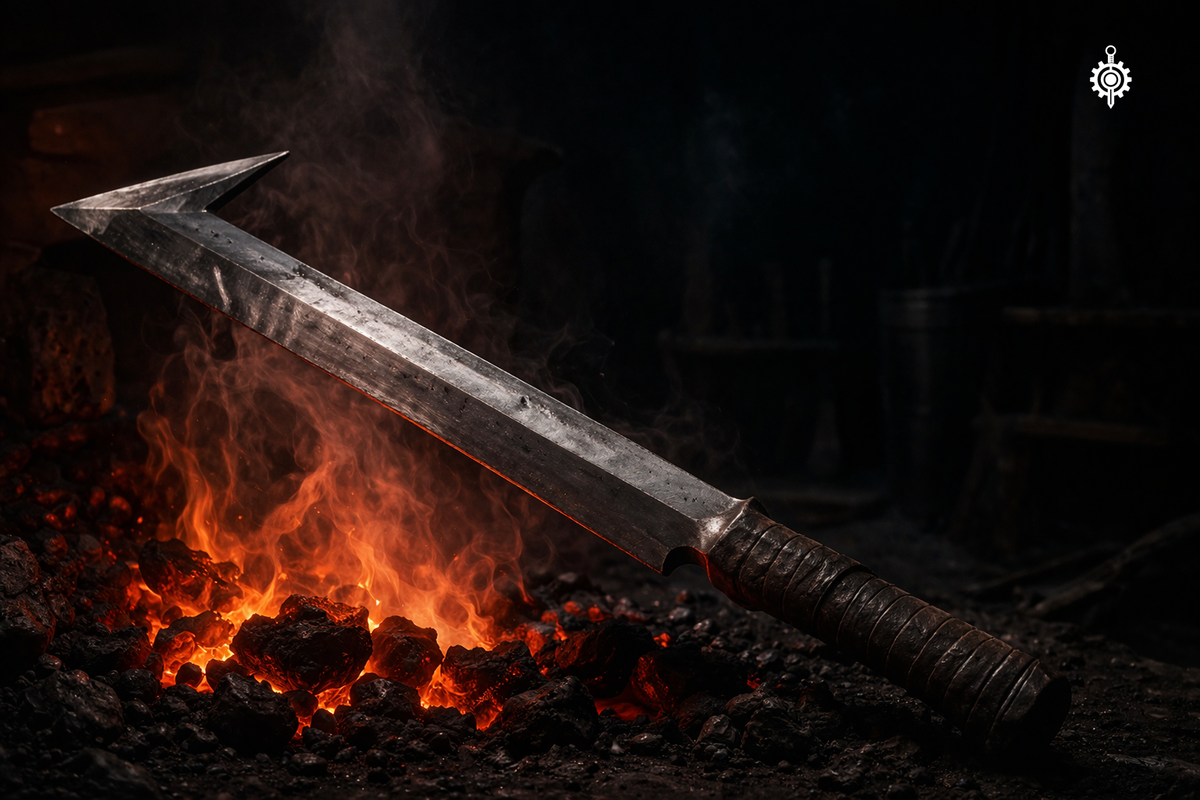Для Урук-хай это означало «функциональный брутализм»: оружие, которое явно отковано в спешке, грубо, без украшений — но с правильными пропорциями, правильным балансом и правильной геометрией рубящего удара. Плохо сделанное оружие убеждает именно тогда, когда оно сделано плохо правильно. Любая случайная кривизна, не обоснованная механикой клинка, немедленно выдаёт себя.