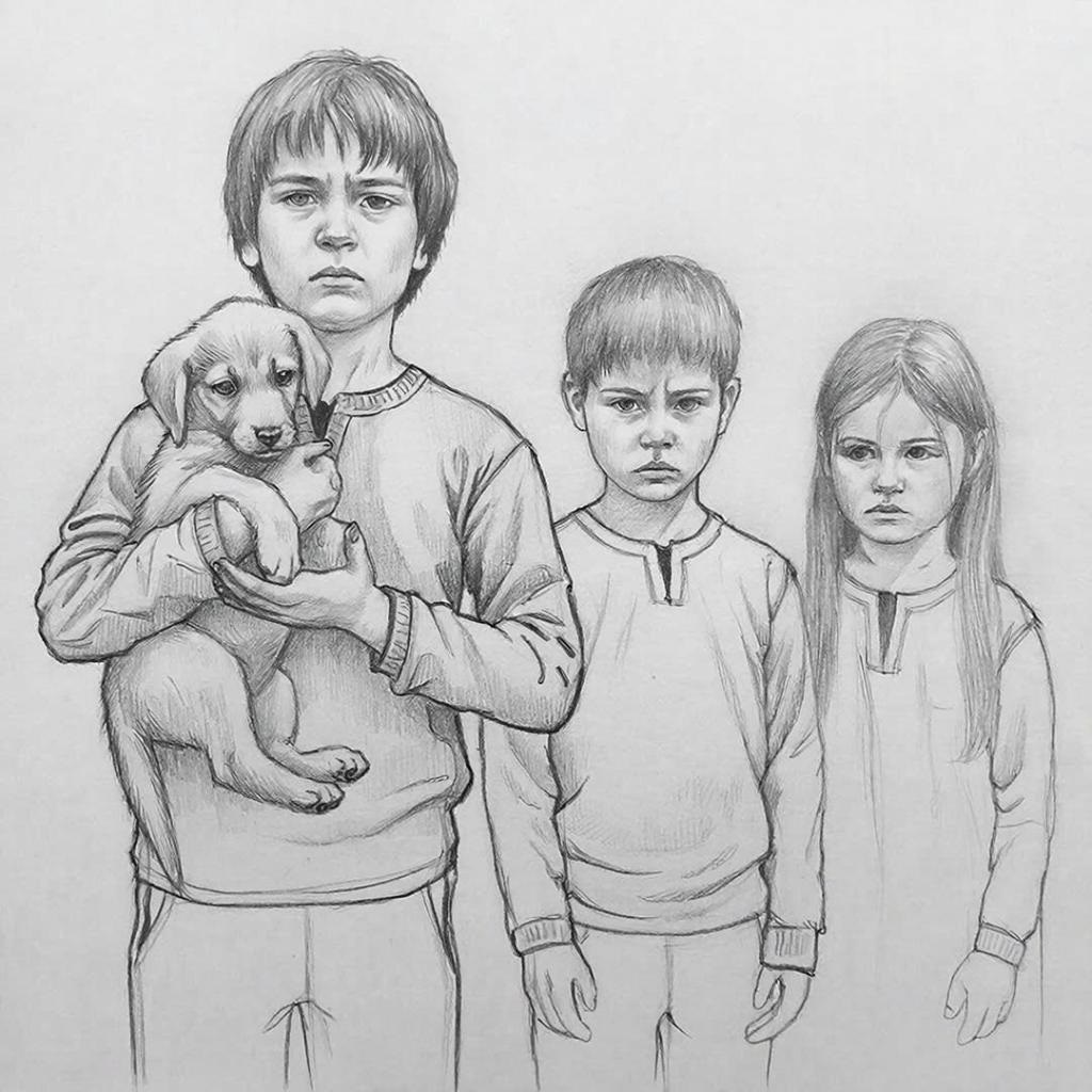Занавеска отдернулась, там стояла мать. Она увидела детей, увидела щенка и не увидела старшего сына: