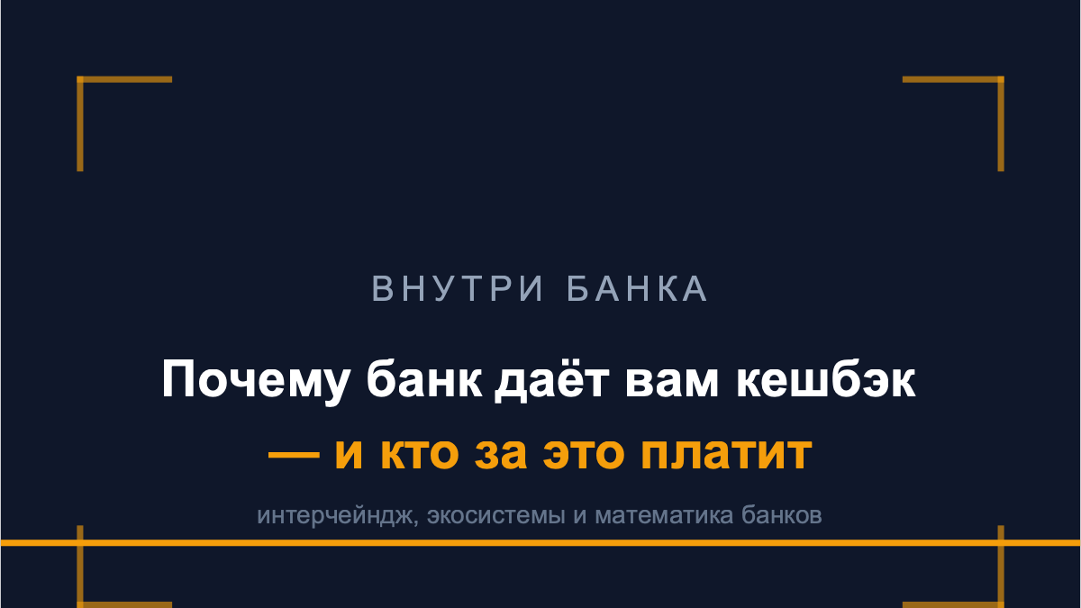 Каждый раз когда вы платите картой — магазин отдаёт банку от 1 до 3% от суммы покупки. Это называется интерчейндж. Вы его не видите, продавец его просто закладывает в цену товара. Часть этих денег банк возвращает вам кешбэком. Не из своего кармана — из кармана магазина, через вас. Поэтому кешбэк 5% на рестораны — это не щедрость. Рестораны платят банку достаточно чтобы банку было выгодно делиться. Продуктовые магазины платят меньше — поэтому там кешбэк 1% или вообще ноль. Это не случайность и не маркетинговые предпочтения — это математика. Отсюда же история с категориями. Банк не случайно даёт повышенный кешбэк на АЗС, аптеки или премиальные рестораны. Там интерчейндж выше — значит банку есть чем делиться. Отдельная история с банками у которых есть экосистема — маркетплейс, доставка, подписки. Они могут давать кешбэк щедрее потому что им выгодно чтобы вы тратили деньги внутри их же сервисов. Каждый рубль потраченный на их маркетплейсе приносит им больше чем просто интерчейндж. Классиче