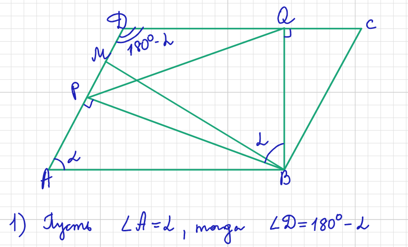 Здравствуйте, дорогие подписчики и гости канала (Было на основной волне 2025) Дан параллелограмм ABCD c острым углом DAB. В нем опущены высоты BP и BQ на стороны AD и CD соответственно. На стороне AD отмечена точка M так, что AM = BP. Известно, что . AB = BQ.