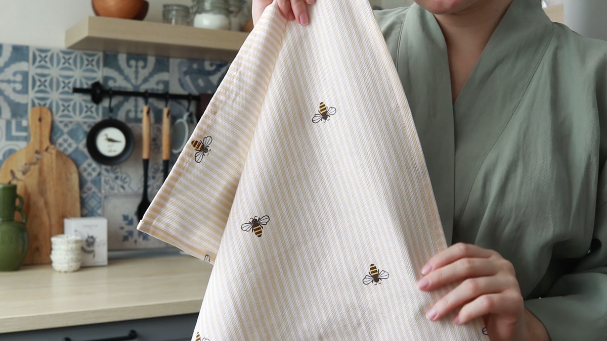 Начнем с очень бюджетной находки. Полотенце в бледно желтую полоску. Но самое главное здесь - это, конечно, пчелки.