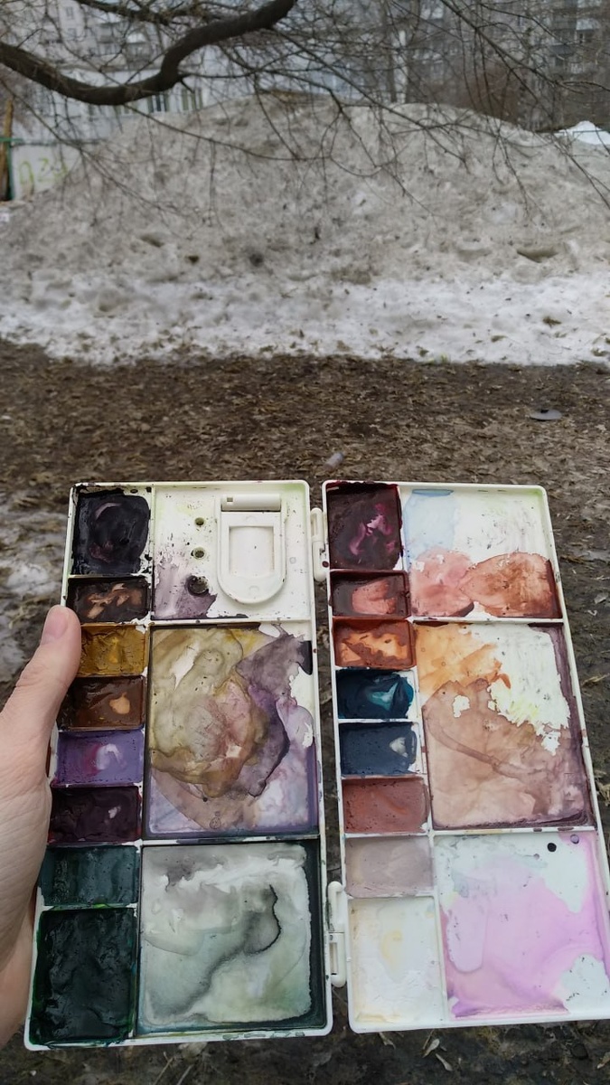 ! Первый раз в году вышла рисовать на улице 🌸 Есть две палитры с гуашью - с яркими цветами и та, что на фото (и даже она слишком оптимистичная лол) Сидела в жуткой сранище среди мальчиков-подростков, наслаждающихся весной Рисунок сначала был плохой, потом стал получше, но затем я опять его испортила Академическая пленерная прошивка с трудом отключается