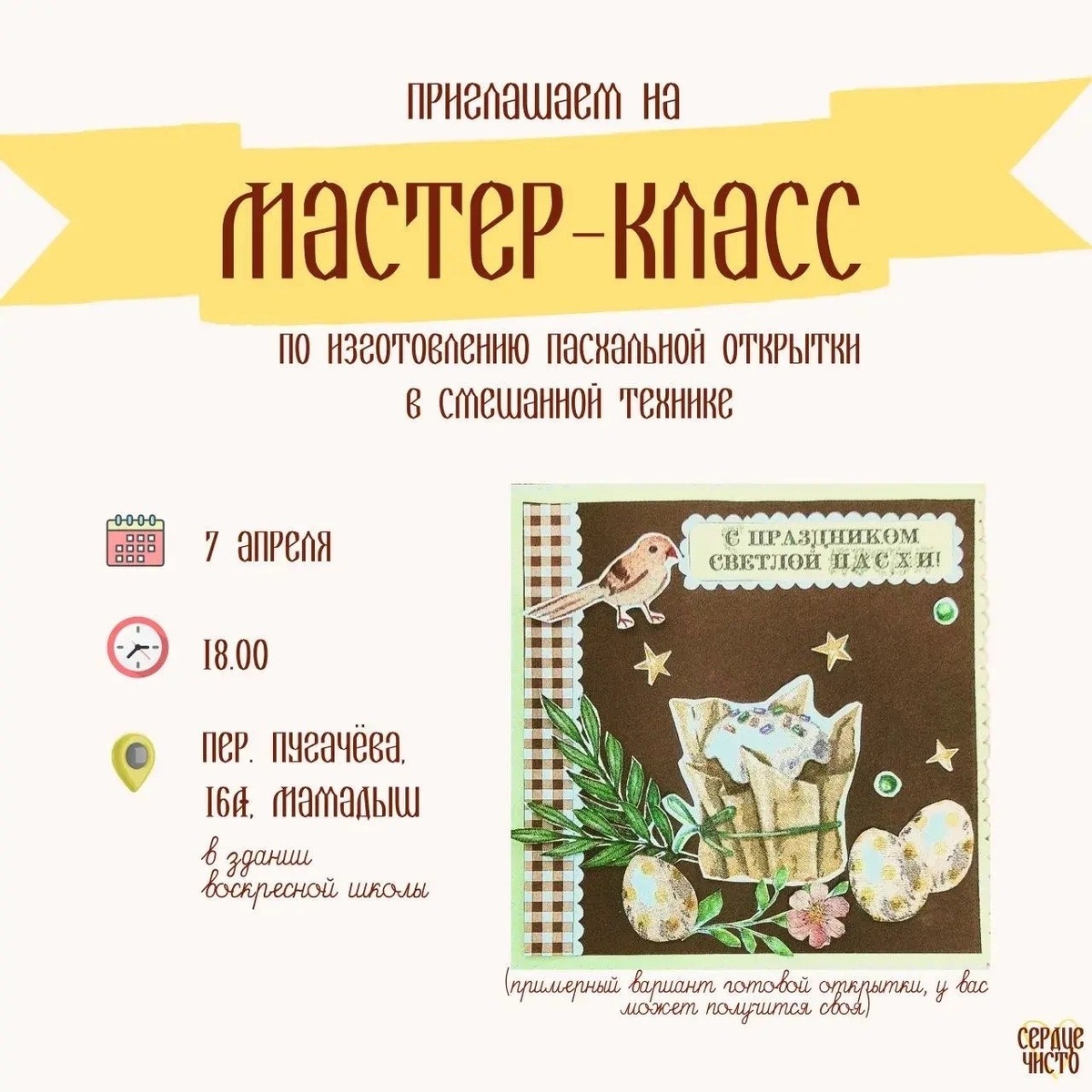 — 7 апреля в 18:00 в здании воскресной школы при храме преподобной Ксении Римляныни в Мамадыше состоится мастер-класс по изготовлению пасхальной открытки в смешанной технике. Участники смогут погрузиться в творческий процесс, создать праздничные открытки для родных и близких, а также узнать больше о празднике Благовещения Пресвятой Богородицы. Мероприятие объединит практическую часть и тематическую беседу, посвященную духовному смыслу праздника. Желающие посетить мастер-класс могут записаться по телефону 8-960-071-09-06 (Анастасия) или через мессенджер MAX. 6+ ✅ Подписаться l Мы в Max
