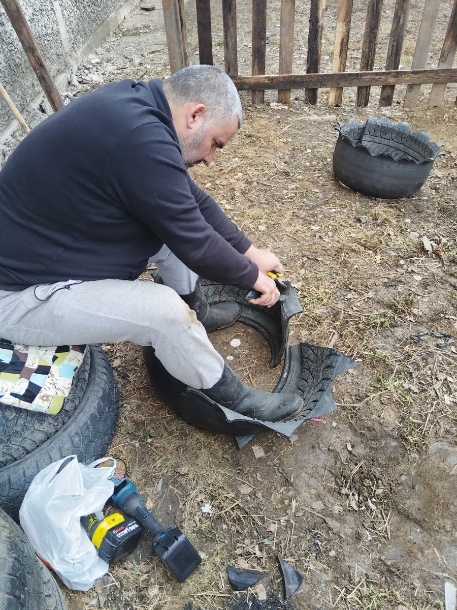 Мы распиливали болгаркой эти покрышки, выворачивали наизнанку и соединяли их шурупами между собой. Покрышки в очень твердом состоянии и очень много усилий требовало, чтобы их вывернуть.Сначала долгое время у нас совсем не получалось, но мы не сдавались, а Исроил в процессе даже падал, но все же вывернули. Приходим раненые домой, то гвоздями поранимся, то ударимся.. в общем это нормальный рабочий процесс. Пока соорудили одну клумбу, сфотографировали ее вам из окна. На вторую времени не осталось, завтра же всем на работу и нужно еще совершить банные процедуры. А вам я желаю легкой и удачной рабочей недели! С уважением к вам, Амиша и Сафия!