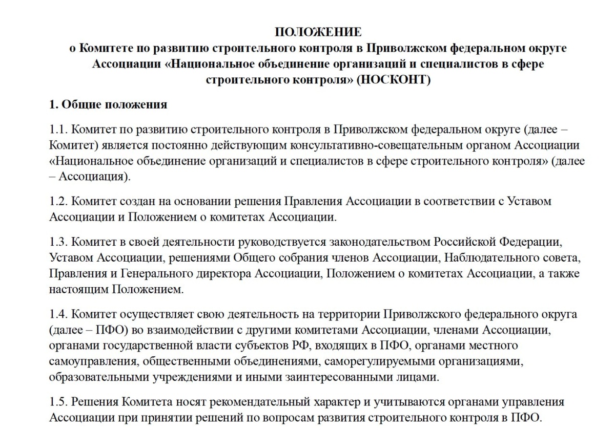 1. Общие положения 1.1. Комитет по развитию строительного контроля в Приволжском федеральном округе (далее – Комитет) является постоянно действующим консультативно-совещательным органом Ассоциации «Национальное объединение организаций и специалистов в сфере строительного контроля» (далее – Ассоциация). Ознакомиться с Положением о Комитете по развитию строительного контроля в Приволжском федеральном округе можно в разделе ДОКУМЕНТАЦИЯ