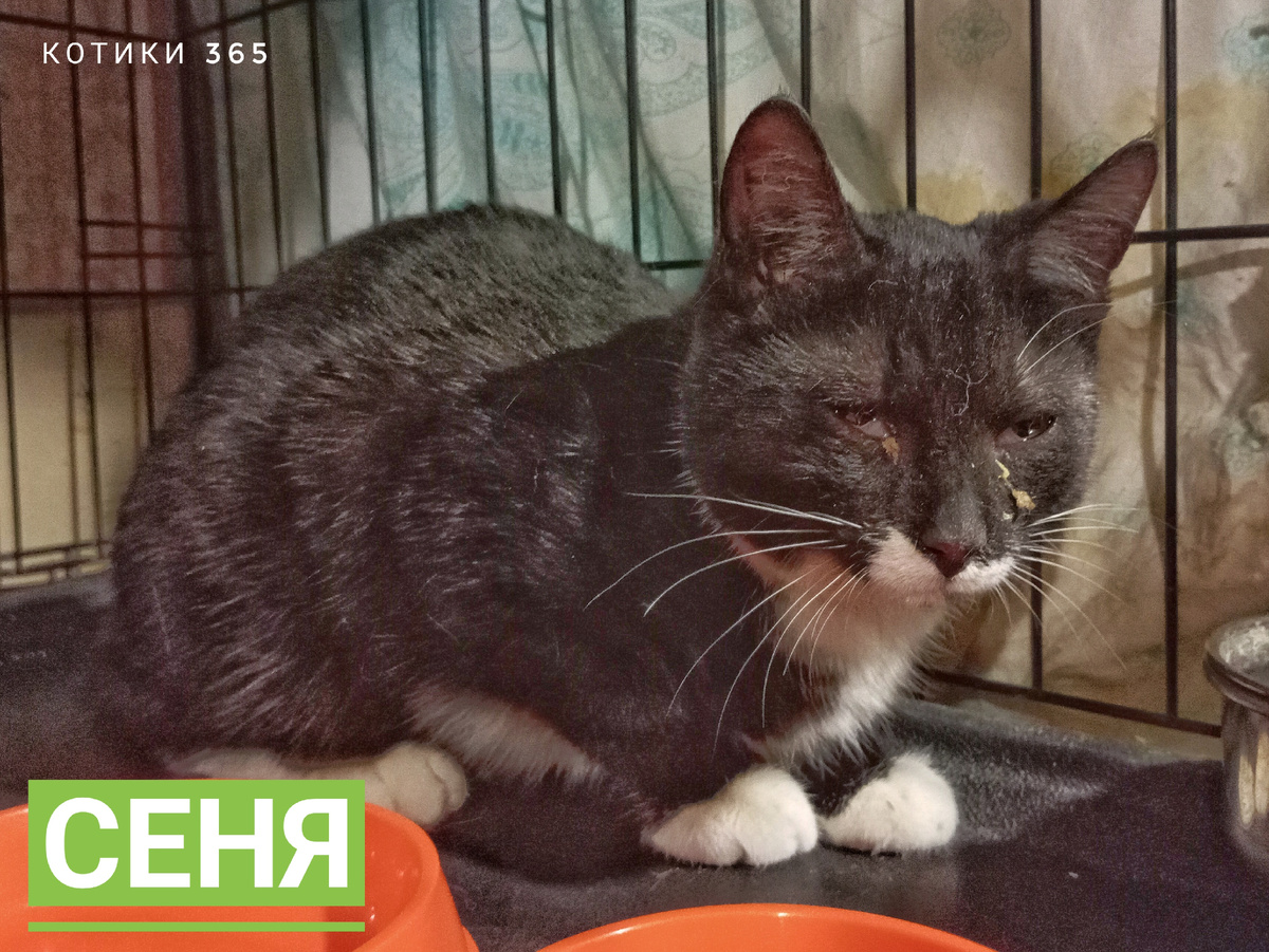 Волонтёрами были пойманы кошки для стерилизации с последующим выпуском на улицу. Среди них оказался котик, его кастрировали. При этом у него оказалась явная респираторка. Выпускать такого больного нельзя, а инфекционный стационар не всем под силу. К нам обратились за помощью. Сеню мы забрали к себе. Будем лечить и одомашнивать.