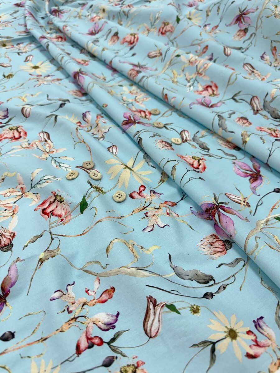 Хлопок поплин стрейч нежно-голубого оттенка с изящным цветочным принтом