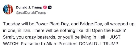 Трамп продолжает угрожать Ирану в социальных сетях "Во вторник в Иране наступит одновременно и День электростанций, и День мостов. Ничего подобного вы ещё не видели!!! Откройте этот чёртов пролив, безумцы, или вы будете жить в аду — просто смотрите! Слава Аллаху", — пишет Трамп. 🔴 Читайте Sputnik Беларусь в MAX