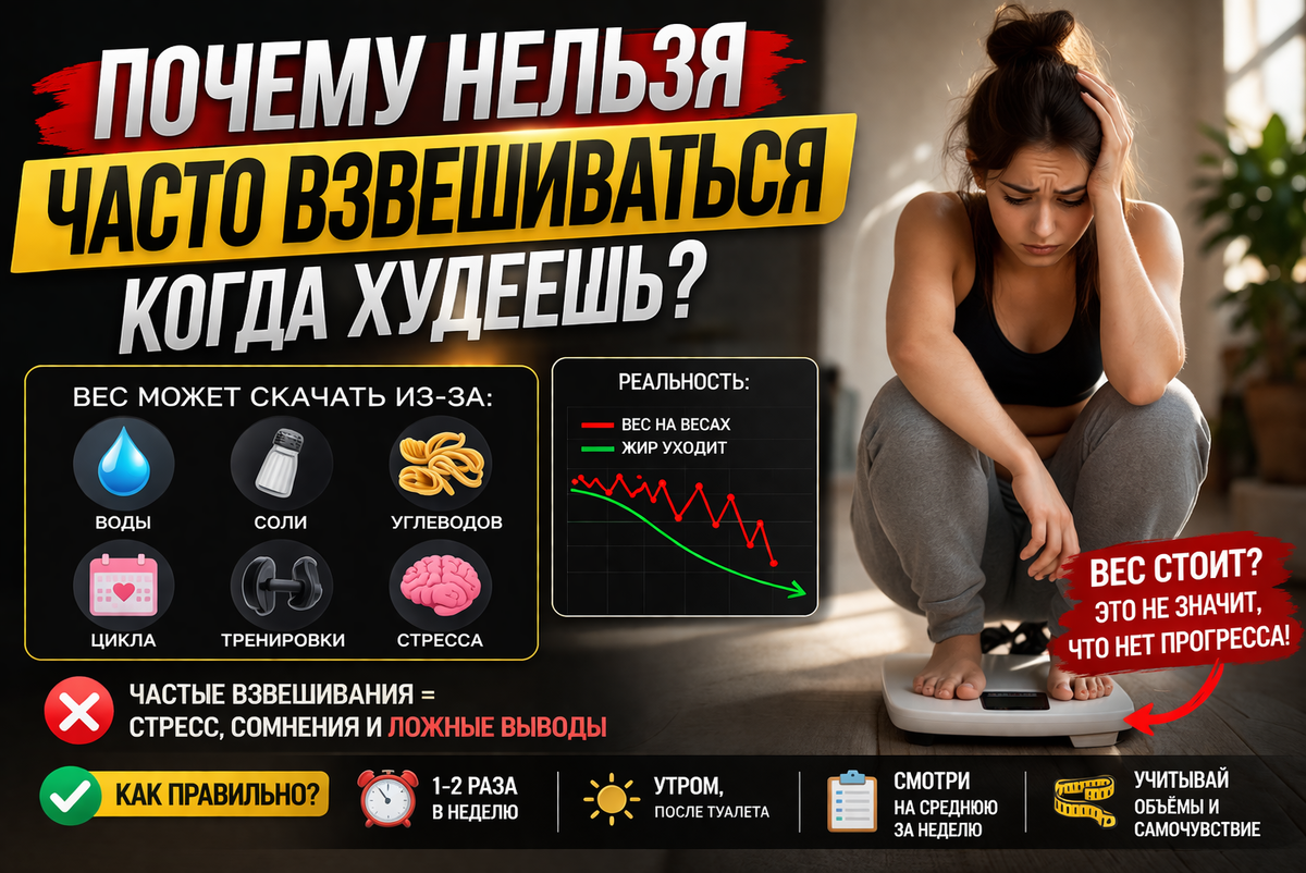 Из-за этого у многих возникает ложное ощущение, что «ничего не работает» или что вес «вдруг пошёл вверх», хотя жир при этом может продолжать уходить. NHS прямо отмечает, что ежедневные взвешивания могут не давать правдивой картины снижения веса, потому что вес колеблется изо дня в день.