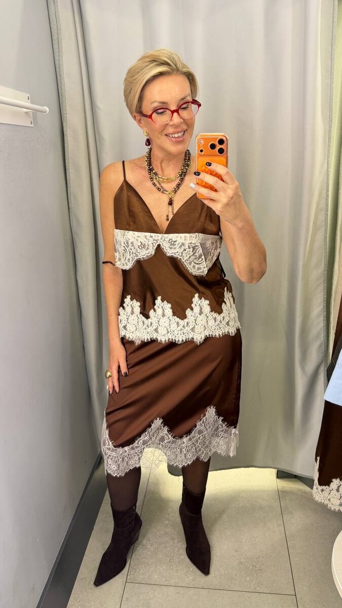Здравствуйте, дорогие читатели! Сегодня предлагаю прогуляться со мной по магазину Befree и вместе примерить стильные новинки. Не забывайте ставить лайк за мои старания! Сейчас снова напугаю ненавистников бельевого стиля вот таким комплектом, который предназначен, о боже, вовсе не для сна! Это юбка и топ в модном шоколадном оттенке, украшенные кружевом. Юбка подойдет более низким девушкам (мой рост 169), а вот топ я себе купила и далее покажу вам его в своем готовом образе, продемонстрировав также еще один способ его ношения. Ссылка на топ Ссылка на юбку Что я имею ввиду под еще одним способом ношения? То, что кружево можно носить не только "вниз", но и надев лямки поверх шоколадной части. Объяснила не очень, но по фото понятно, что я имею ввиду. А вот, собственно, и сам образ. Как вам? Вариант верхнего слоя - стильный тренч с необработанными краями, которые, собственно, и являются его фишкой. Также отличает этот тренч от классических представителей и резинки на рукавах - эта идея мне