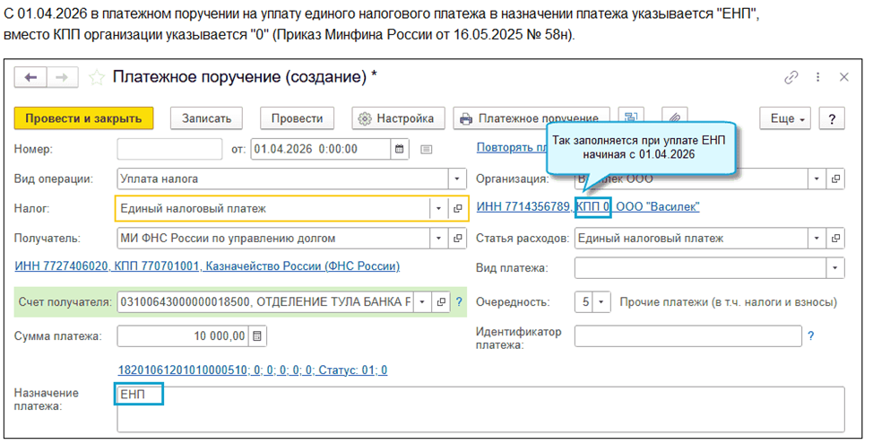 Заполняем платежные поручения на оплату ЕНП правильно, с 01.04.2026 г.