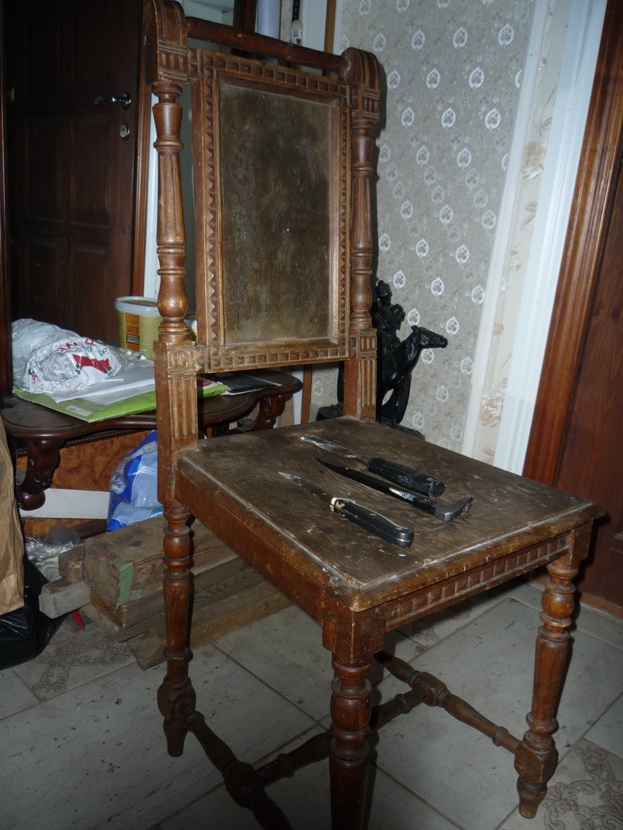 или Служивый товарисч возвращается в строй (№2) Вот и страстная неделя на носу. Есть примета- НЕ НАЧИНАТЬ НОВЫЕ ДЕЛА ( на страстной неделе) а только заканчивать уже начатое. Ну и как не порадовать соседей пасхальным подарком? Есть стимул. Да и аграрно-огородный сезон на подходе- не до столярки( темными зимними вечерами). По порядку. Больной=служивый был в аховом состоянии. И гораздо сложнее по работе чем ДУБОВЫЙ №1( см выше и раньше). Весь прошитый гвоздями в сочленениях-зашиповке как картечью. Учитывая его обитание в сырых местах,- с неделю размачивала WD40, чтобы вытащить ржавые гвозди и гвоздики- от 50мм до почтовых.. Были и обломы шляпок от ржавости и криворукость забивания-такие были наверно послевоенные «ремонтики»- из того что было. И вот по палочкам- по палочкам- лежит аки в морге у паталогоанатома. Вывод- а надо усиливать переплет сиденья( очень тонковато)- от чего и расшатывались клееные узлы. А мы ж все выше и толще… Сидуха родная вся в расслое- приговор- надо новую ставить