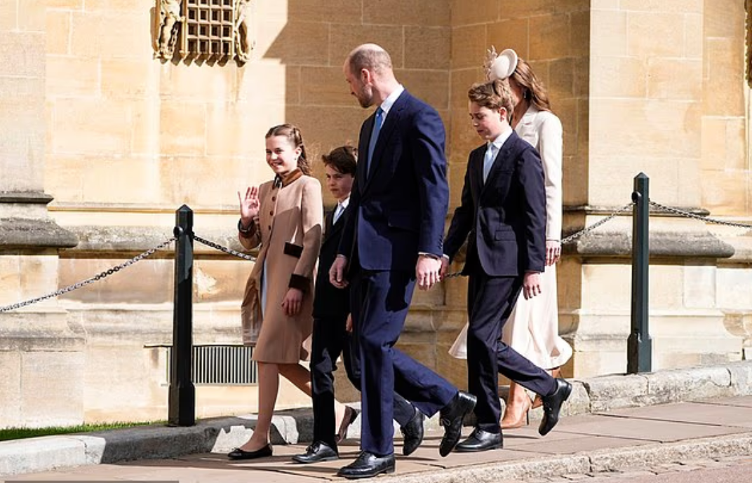 Кейт была одета в молочно-белый ансамбль — юбка, элегантный жакет и шляпа с листьями, — Уильям и мальчики щеголяли в тёмно-синих костюмах и галстуках. Принцесса Шарлотта в нарядном платье под тёплым пальто цвета кэмел с коричневым бархатным воротником и манжетами выглядела счастливой и приветственно махала толпе. Луи гордо шагал рядом с ней.