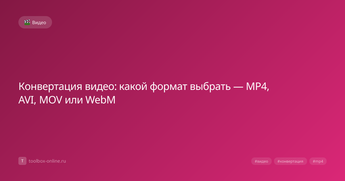 Разные устройства и платформы поддерживают разные форматы видео. MP4 (H.264) — самый универсальный, но не всегда оптимальный. iPhone записывает в MOV, старые камеры — в AVI, экраны записываются в WebM. Конвертация нужна для совместимости, оптимизации размера и публикации. Для максимальной совместимости — MP4 (H.264). Для минимального размера — MP4 (H.265) или WebM (AV1). Для веб-сайта — WebM с MP4-фолбэком. Для архива — оригинальный формат или ProRes для профессионального видео. Совет: при конвертации сохраняйте оригинальный файл — каждая перекодировка немного снижает качество (generation loss). Если вам нужен один и тот же ролик в нескольких форматах, конвертируйте каждый раз из оригинала, а не из предыдущей конвертации. Наш конвертер поддерживает все популярные форматы и обрабатывает видео локально в браузере с выбором качества, разрешения и кодека.