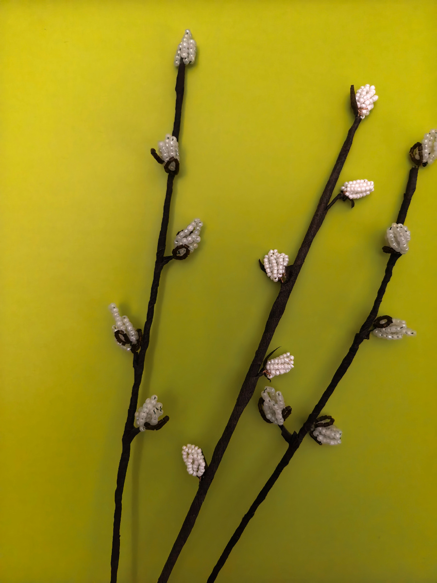На фото верба сделана двумя способами. Те ветви где бисер тусклее сделаны в прошлом году, а в этом веточка из более белого бисера и она мне конечно больше нравится. Сначала набираю 15 бусин и делаю петельку на одном конце проволоки, потом также на другом. То есть на одну почку нужно делать четыре петельки по 15 бусинок. Делаем пять почек. Из тейп-ленты отрезаю кусочек 3 сантиметра и режу его от угла к углу, чтобы получились уголки, которые наматываю под почку. Дальше все почки, начиная с верхней прикручиваю при помощи тейп-ленты, она липкая и хорошо фиксирует на палочке. Палочку можно взять от суши, или тонкие длинные шпажки, можно толстую проволоку от электрики. В общем фиксировать можно на разную основу , раньше я делала на толстую проволоку, но сейчас плету бумажной лозой и зафиксировала на трубочке из бумажной лозы. И под почкой шелуху мне понравилось больше делать из тейп-ленты, а не коричневым бисером, смотрится естественнее. Трудностей у меня не возникло, одна ветка-15 минут в