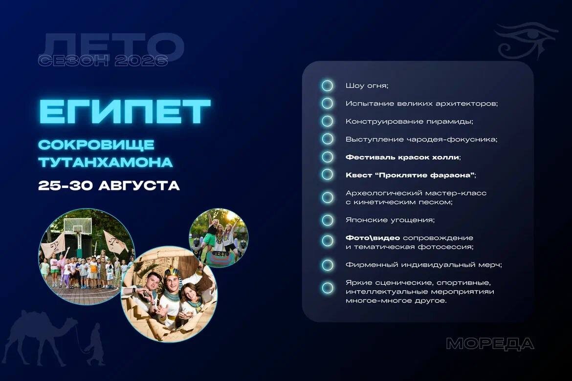 ? 😉 Летом «Детская Республика «Поленово» превратиться в жаркий Египет🔥 Ребята отправятся в незабываемое путешествие, где смогут: ✨Узнать историю этой страны; ✨Попасть на археологический мастер-класс; ✨Полюбоваться на настоящее шоу огня; ✨Сконструировать Египетскую пирамиду; ✨Посмотреть выступление чародея-фокусника! 📆Все это станет возможным 25—30 августа в смене детского тематического лагеря Мореда🇪🇬 Если у вас ещё нет путевки, то сейчас самое время исправить это💫 🖥Бронируй на сайте https://drpolenovo.ru/oszi.html До встречи🫂