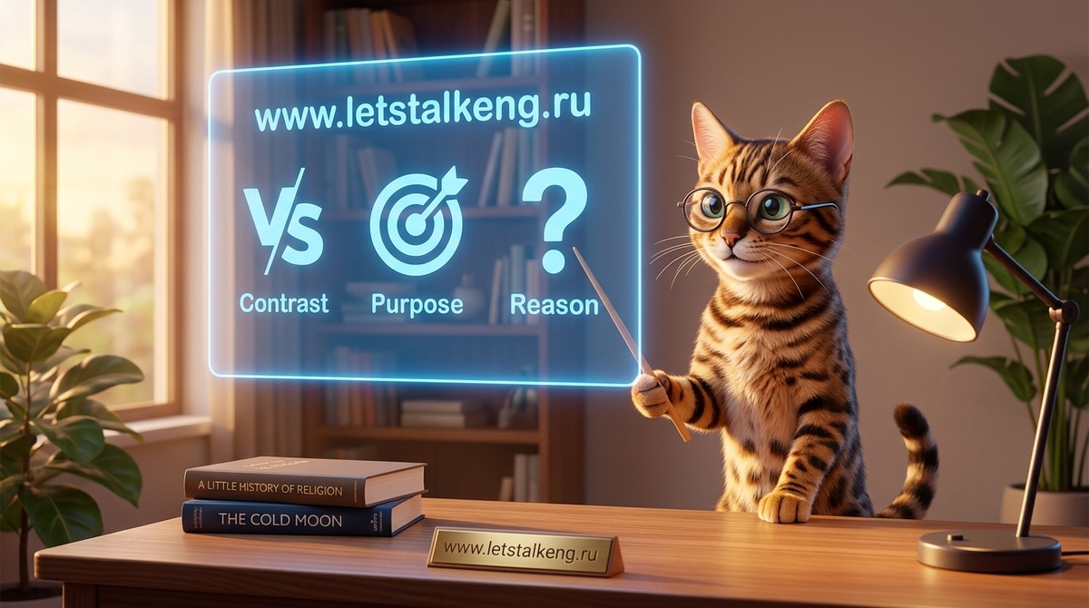 Как часто мы хотим выразить сложную мысль, но спотыкаемся на полуслове? «Я пошел в магазин, чтобы…», «Я опоздал, потому что…», «Несмотря на дождь, я гуляю…». В английском языке эти связки называются Clauses of contrast, purpose and reason. Они — тот самый «клей», который превращает отдельные фразы в красивую, логичную и взрослую речь уровня Intermediate (B1). Давайте разберем, как соединять идеи так же изящно, как наша бенгальская кошка Фаня прыгает за лазерной указкой. Учить английский спокойно, с уважением к своему ритму жизни — это реально. Я приглашаю на онлайн-уроки, где всё внимание уделяется исключительно вам и вашим целям. Узнать подробности и записаться на занятие можно на моей странице: Обо мне | Цены Когда в одном предложении сталкиваются две противоположные идеи, нам нужны уступительные союзы. 1. Although и Even though (Хотя) Используются в начале или в середине предложения. После них всегда идет полноценная основа: кто + что делает. 2. Despite и In spite of (Несмотря на) Э