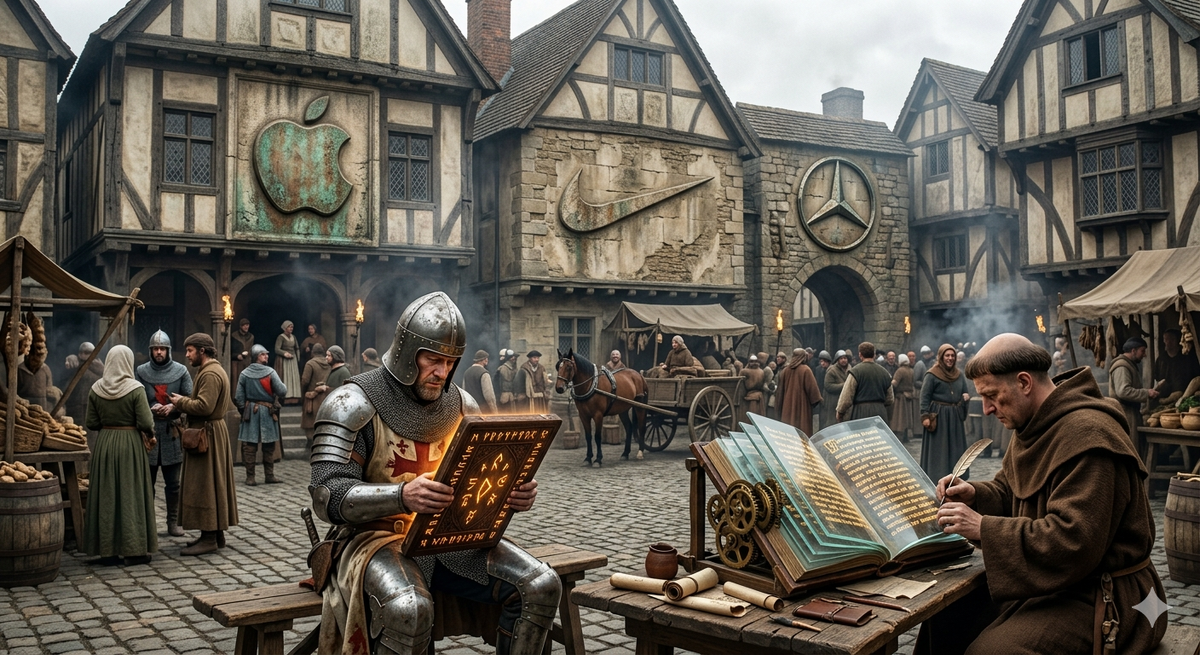 Я попросил нейросеть перенести современные бренды в Средневековье. Не просто «нарисовать логотип старым», а создать мир, где Apple, Nike, IKEA и Mercedes существуют по законам феодалов и цеховых мастеров.