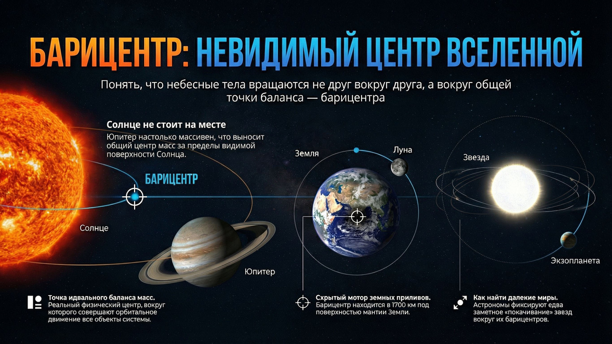 Забудьте те упрощенные школьные картинки, где планеты послушно крутятся вокруг неподвижной звезды. В реальной, точной науке всё работает иначе: абсолютно все объекты в связанной системе вращаются вокруг общего центра масс — того самого барицентра. Давайте разберем, как это работает, шаг за шагом!