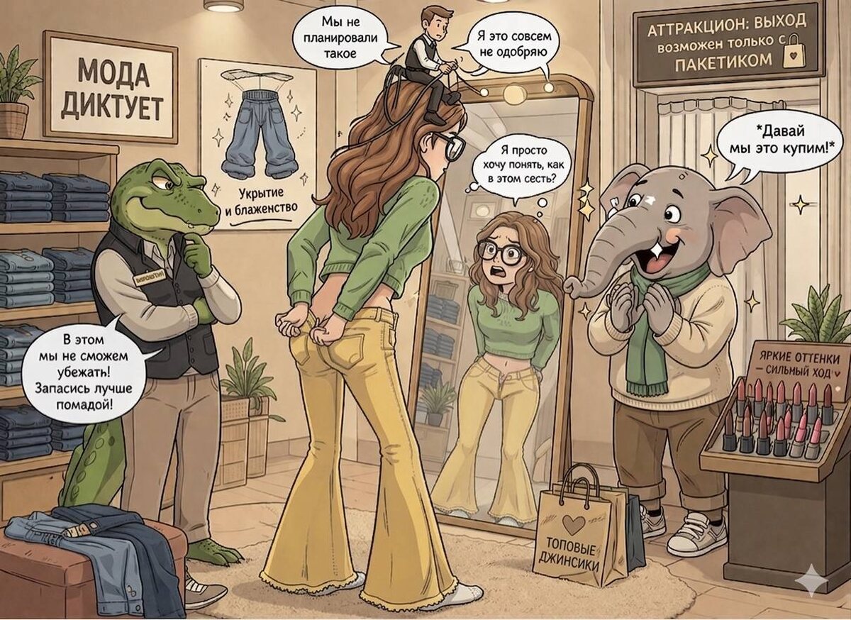Чтобы понять, почему в магазине мы ведем себя странно, нужно познакомиться с тремя внутренними героями. Рептилия — самая древняя часть, она отвечает за базовое выживание и всегда хочет «запастись впрок», особенно если вокруг много ярких пятен и странных запахов. Слон — это наши эмоции, привычки и капризы; он обожает всё блестящее, мягкое и то, что напоминает о приятном прошлом. И, наконец, Всадник — наш разум и логика, который пытается рулить этим огромным Слоном, держа в руках список покупок и калькулятор, но часто сдается под напором обстоятельств. Поход в современный торговый центр — это не просто покупка вещей, это полноценный визит в интерактивный музей современного абсурда. Вы заходите туда как свободная личность с четким планом, а выходите в легком недоумении, как в вашей сумке оказалась помада цвета «пасмурные девяностые» и штаны, в которых даже стоять — уже смелый вызов обществу. Здесь каждый манекен пытается прошептать тебе что-то на ухо, а зеркала в примерочных обладают собс