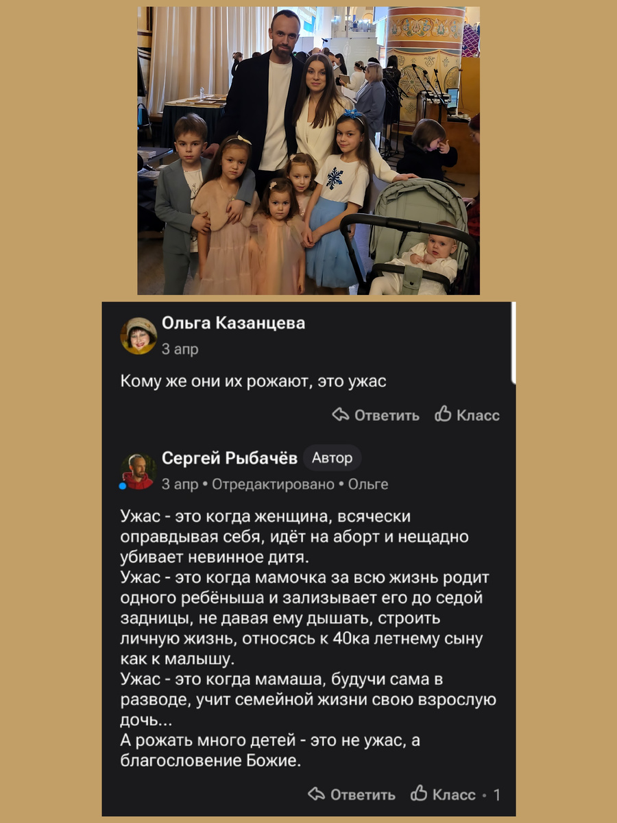 Некоторых буквально колбасит при виде большой многодетной семьи, в которой папа не кинул маму, а мама верна папе, где дети с раннего возраста учатся помогать, уступать и защищать друг друга...