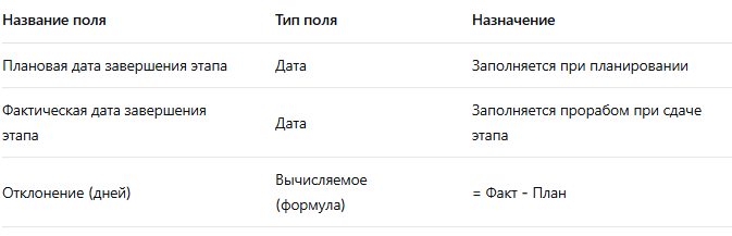 - Пользовательские поля с плановыми и фактическими датами — «Плановая дата завершения этапа», «Фактическая дата завершения этапа».