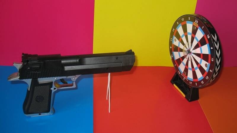 Играющий должен, прицелиться с расстояния в несколько метров в центр мишени и нажать на спусковой крючок пистолета, после чего включится электронная управляющая схема, которая заставит лазер выпустить короткий световой импульс, при этом востренный динамик издаст звук, имитирующий звук выстрела. Если рука твердая и прицел верный, световой луч попадёт точно на фотоэлемент в центре мишени, который передаст электрический импульс в электронную схему, а она включит победную музыку и мигающие цветные лампочки, сигнализирующие об удачном выстреле. Простая по игровому замыслу игрушка в конструктивном исполнении представляет собой набор высокотехнологичных устройств и элементов. Конечно, прежде всего, интересен лазерный источник света, излучающий тонкий, яркий луч красного цвета.