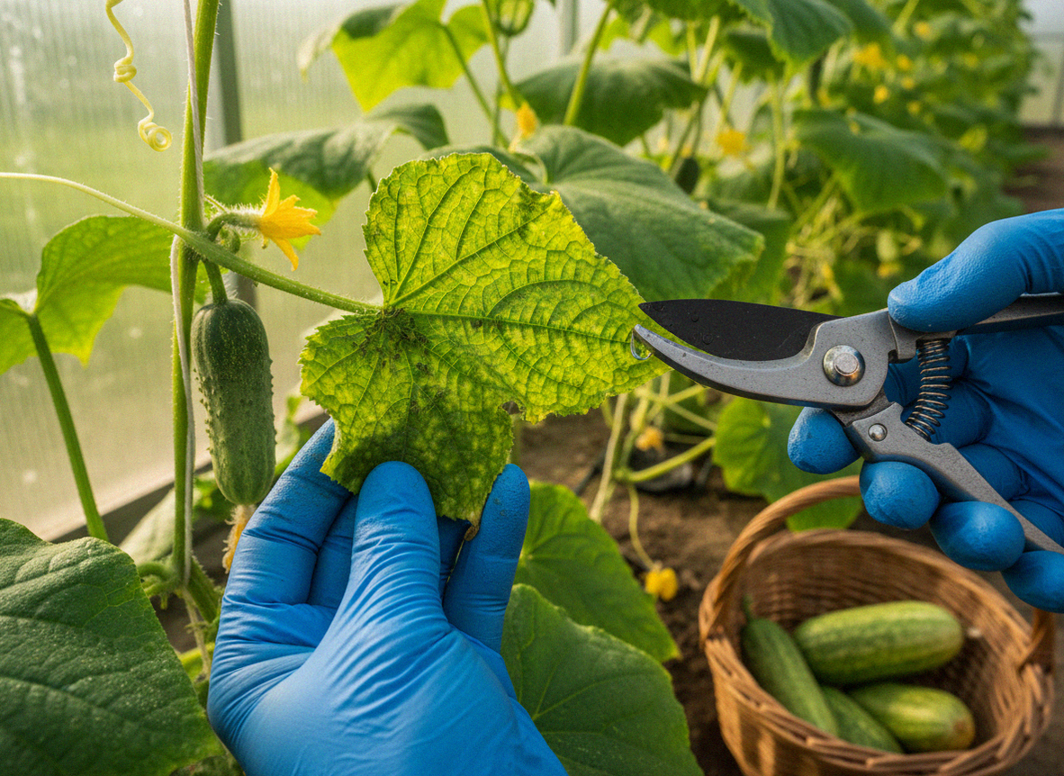 Используем только разрешённые средства и дезрастворы, строго по инструкции и нормам вашей страны. Болезни листьев огурцов и вирусные болезни огурца подтверждаем диагностикой; сходные признаки иногда дают стрессы и другие причины.