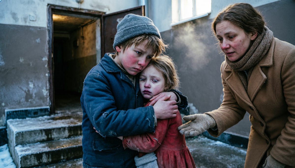 Ветер в тот вечер не просто дул — он выл, словно раненый зверь, разрывая на клочья серую пелену декабрьского неба. Снег, крупный и колючий, хлестал по лицу, мгновенно превращаясь в ледяную корку на ресницах. Девятилетний Артём крепче прижал к себе четырехлетнюю сестренку Катю. Его тонкая куртка, когда-то ярко-синяя, а теперь выцветшая до грязно-серого оттенка, уже не грела. Она лишь создавала иллюзию защиты, которую пронизывающий холод разрушал за считанные секунды.