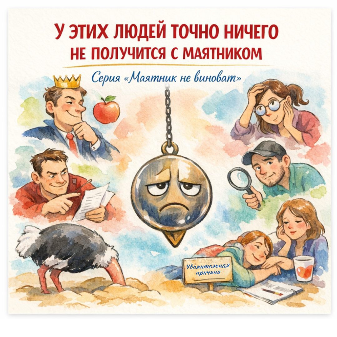 «Как задавать вопросы маятнику, чтобы получать правдивые ответы?», «У кого маятник не работает?» - эти вопросы всегда в топе. Вариантов ответов много и часто они зависят от опыта и знаний оператора. Сегодня меня достали вопросом про то, что маятник работает не у всех. Это даже не вопрос, а убеждение конкретного человека. Настолько сильное, что он как будто взял меня "за грудки" и начал трясти и выговаривать своё убеждение. Ладно. Убедил. Ловите список - у того точно не получится. 1. Исключительные. На них общие законы не распространяются. Вообще никакие. Закон всемирного тяготения смотрит на них с уважением и деликатно отступает. Маятник, к сожалению, такой же уважительностью не отличается. 2. Тревожники с железной хваткой. Берут маятник - и сжимают так, что костяшки белеют. Маятник не качается. Сжимают крепче. Маятник по-прежнему не качается. Вывод: "Не работает." Работает. Но он не граната - можно разжать руку. 3. "Я точно без способностей". Маятник начинает двигаться - человек реша
