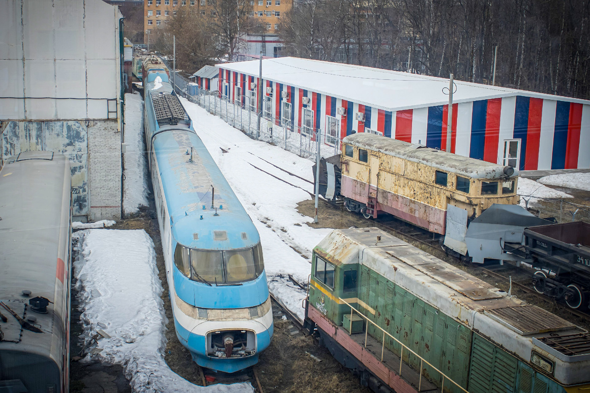 Главный интерес из себя представляет тот пепелац, что расположился на переднем плане - это экспериментальный высокоскоростной электропоезд ЭС250 "Сокол", который так и не полетел. Данный состав был построен в 1998 году и должен был стать самым скоростным поездом на наших железных дорогах. Но что-то пошло не так и добрался он лишь по частям до двух музеев, и то половинка позже стала заброшкой... Справа в кадре также расположился снегоочиститель СДПМ, а ближе к центру фотографии виднеется тепловоз ЧМЭ2-120.