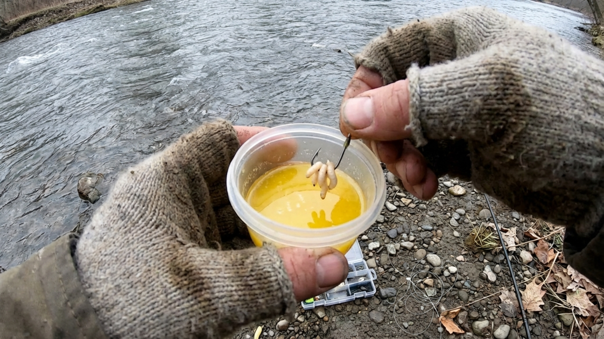 Я беру пучок опарышей на крючке, аккуратно макаю их в теплую баночку с маслом. Затем беру еще буквально пол чайной ложки этой жирной массы и вминаю ее прямо внутрь закормочной кормушки, поверх черной земли. Делаю хлесткий заброс на бровку.