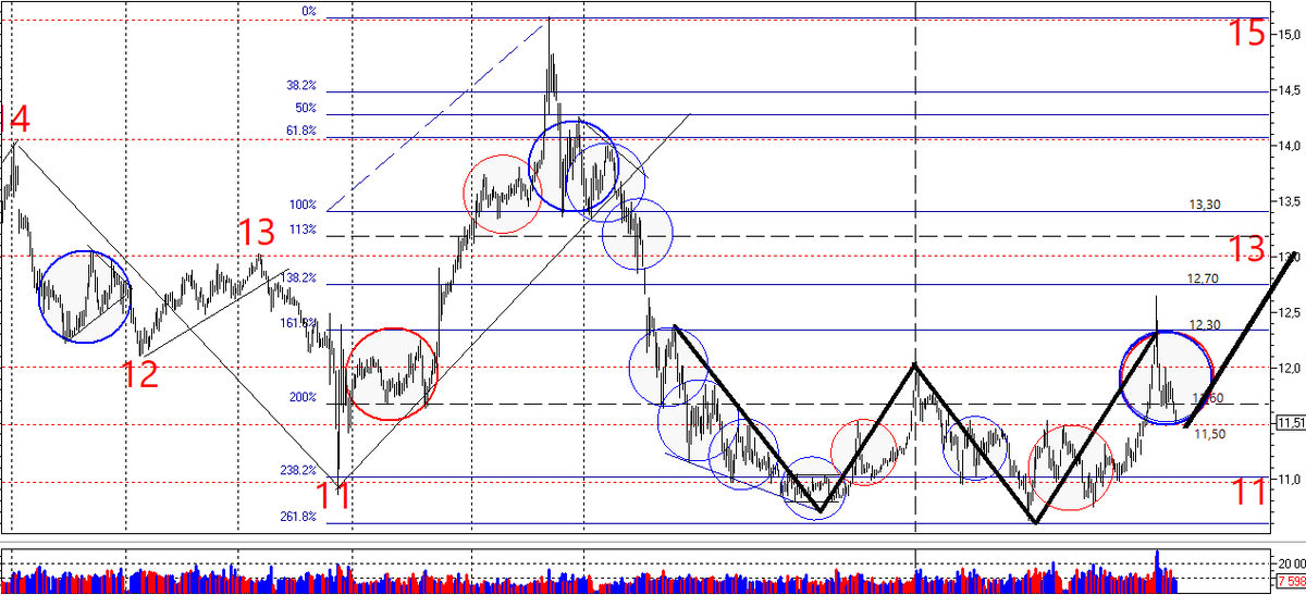Всем привет! Ситуация на графике cny/rub_tom продолжает демонстрировать нисходящее движение, в связи с чем у меня возник ряд вопросов (прежде всего, к самому себе), так как ранее закрылись по стопу «плечи» (при прорыве 11,65 вниз), но при этом я продолжаю удерживать лонг в позиции «на своё». Мне очень не хотелось бы «жениться» на убыточной позиции, поэтому я задам себе ряд ключевых вопросов, чтобы исключить в дальнейшем возможные «эмоциональные качели», порожденные, как правило, - страхами, сомнениями и отсутствием четкого видения ситуации. Итак, вопросы в студию: 1. Сохраняется ли общий среднесрочный прогноз в район 13? 2. Продолжает ли существовать АВС-зигзаг, о котором я упоминал ранее? Если да, - то на каком этапе своего существования? 3. Буду ли я закрывать позицию «на своё», если снижение cny/rub_tom продолжится далее, или я буду усредняться «на плечи». Ответы: 1. Среднесрочный прогноз в район 13 по-прежнему актуален, так как «двойное дно» не сломлено, просто идет затяжной откат