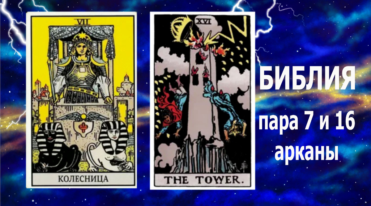- в обоих энергиях присутствует символ БАШНИ: у 16 аркана башня разрушена, особенно верх, крыша , а у 7 аркана на заднем плане множество не разрушенных башен с целыми крышами.