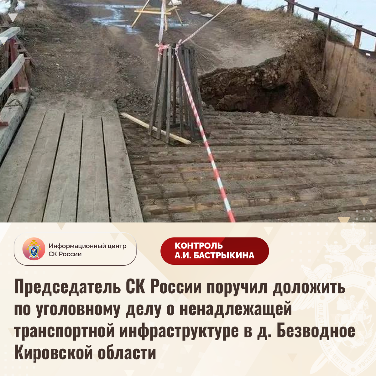 Председатель СК России поручил доложить по уголовному делу о ненадлежащей транспортной инфраструктуре в д. Безводное Кировской области В СМИ сообщается о нарушении прав жителей деревни Безводное Кировской области на качественную транспортную инфраструктуру. В марте текущего года из-за непринятия мер к ремонту автомобильного моста через реку Тумшинка, ведущего к домовладениям граждан на улице Заречной, сооружение частично разрушилось, в связи с чем было закрыто для проезда транспортных средств. Кроме того, альтернативная переправа непригодна для проезда крупногабаритной техники и автомобилей экстренных служб. Обращения в уполномоченные органы результатов не принесли. В СУ СК России по Кировской области возбуждено уголовное дело. Председатель Следственного комитета Российской Федерации Александр Иванович Бастрыкин поручил и.о. руководителя СУ СК России по Кировской области Султану Шагировичу Оразаеву доложить о предварительных и окончательных результатах расследования уголовного дела. И