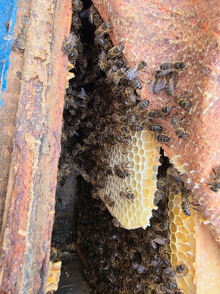 Матка уже отложила яйца, пчелиный самострой удалил, дал рамку вощины, можно было поставить даже 2 вощины, но к нам идет похолодание, так что поставил