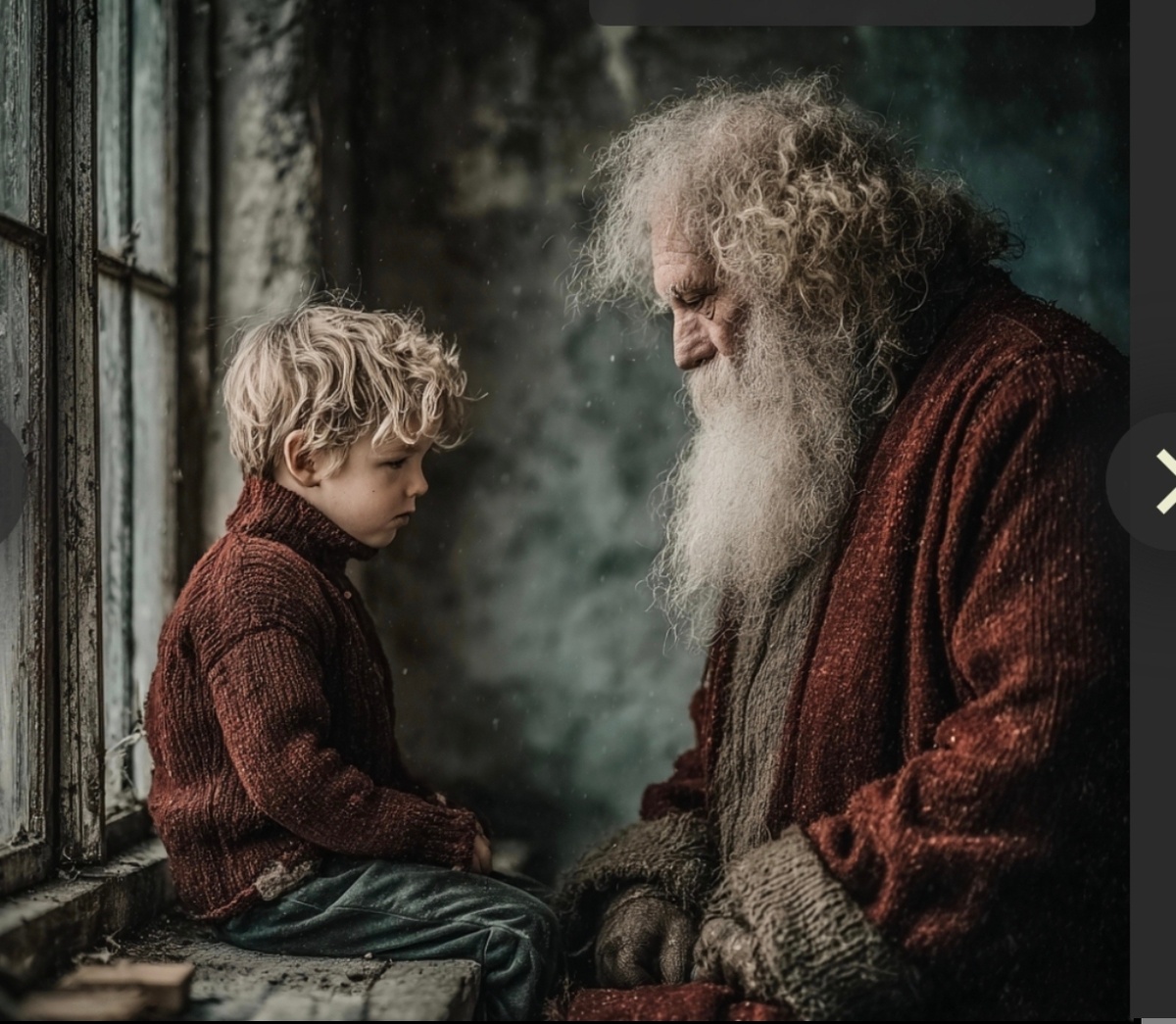 Во двор въехала большая белая машина. Из неё вышел Дед Мороз. Серёжа был достаточно взрослым и понимал, что Деда Мороза не существует. Но картина за окном заворожила его. «Дед» был очень необычный. Вокруг него, словно в волшебном танце, плавно поднимались вверх и медленно опускались вниз хрупкие белые снежинки. Совсем как в мультфильме, где к мальчику приехал самый настоящий Дед Мороз и исполнил его заветное желание. «Вот бы мне так», - промелькнуло в голове у Серёжи. Словно услышав эти мысли, "дед" поднял голову и посмотрел мальчику прямо в глаза. Сергей даже плакать перестал от неожиданности. Дед Мороз улыбнулся и кивнул: «Ну, что ты, мол, тянешь, загадывай уже!» И ударил по земле посохом. Вокруг всё засияло, и вверх взметнулись маленькие голубые звёздочки. Серёжа зажмурился и торопливо проговорил: