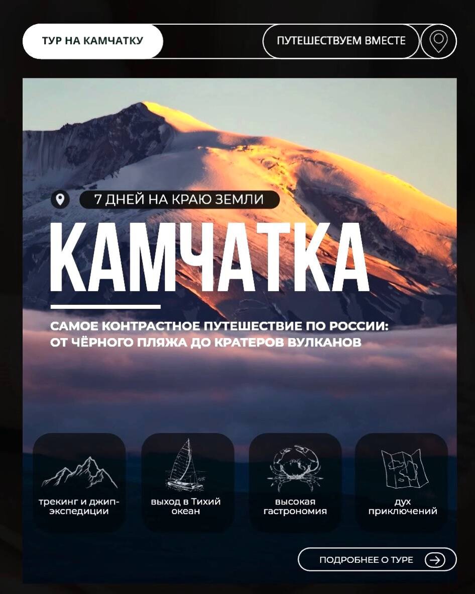 За неделю вы сможете почувствовать характер региона, увидеть его природное разнообразие и при этом сохранить комфортный ритм поездки. В программу входит: ➡️ 3 вулканических направления с разным характером рельефа ➡️ морской выход в Тихий океан на яхте ➡️ треккинг по долинам и перевалам ➡️ экспедиция на джипах ➡️ посещение термальных источников ➡️ гастрономические вечера с локальными продуктами ➡️ и многое другое! По желанию программу можно дополнить рыбалкой или вертолётным облётом. ✅ Этот формат отлично подходит для пары, семьи с детьми или компании друзей. А главное — представленная программа тура лишь пример. Мы можем адаптировать маршрут под ваши интересы, состав группы и темп отдыха. Лучшее время для путешествия на Камчатку – с июня по сентябрь. 💡 Успевайте бронировать даты заранее, пока доступен лучший выбор по программе и размещению. 💬Напишите нам, чтобы узнать подробнее о путешествии, обсудить детали и оставить заявку на разработку программы тура. 🔔Подписаться