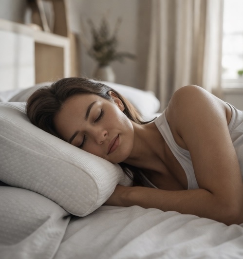 Правильная подушка заполняет естественный изгиб шеи (шейный лордоз) и поддерживает голову так, чтобы позвоночник от затылка до копчика находился на одной линии.