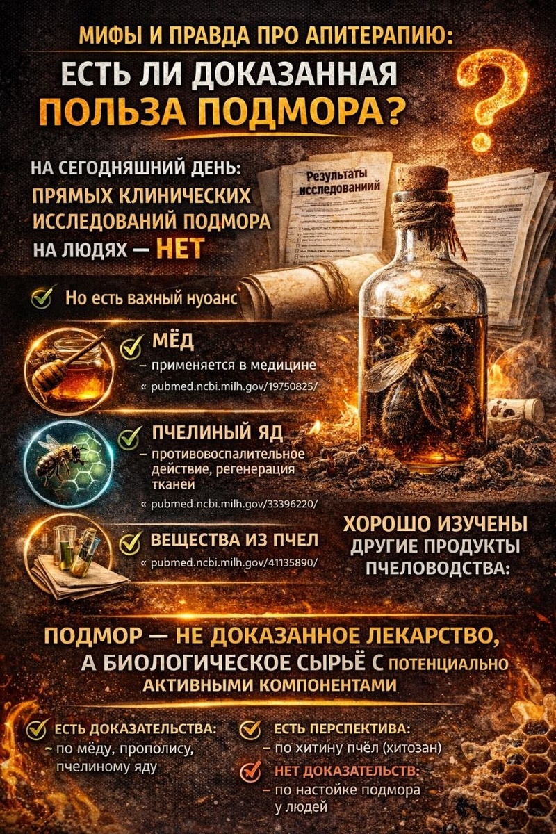 ? ## 📲 Пост 4 - завершающий. --- За время этой серии мне задали главный вопрос: 👉 “А есть ли доказательства, что подмор реально помогает?” Отвечаю ; --- ### 🔬 Что говорит наука На сегодняшний день: 👉 прямых клинических исследований подмора на людях — нет Да, это факт. --- ### 🧬 Но есть важный нюанс Хорошо изучены другие продукты пчеловодства: ✔️ мёд — применяется в медицине для заживления ран 👉 https://pubmed.ncbi.nlm.nih.gov/19750825/ ✔️ пчелиный яд — противовоспалительное действие, регенерация тканей 👉 https://pubmed.ncbi.nlm.nih.gov/33396220/ 👉 https://pubmed.ncbi.nlm.nih.gov/37997319/ --- ### 🧠 А где здесь подмор? Подмор интересен науке как: 👉 источник биологически активных веществ В нём содержатся: * хитин (основа для хитозана) * остатки биоактивных соединений * липиды * пептиды --- ### 🔬 Что изучается Отдельно изучают: 👉 хитозан — антимикробные свойства — заживление тканей 👉 пептиды пчёл — подавляют бактерии 📌 пример исследования по хитоза