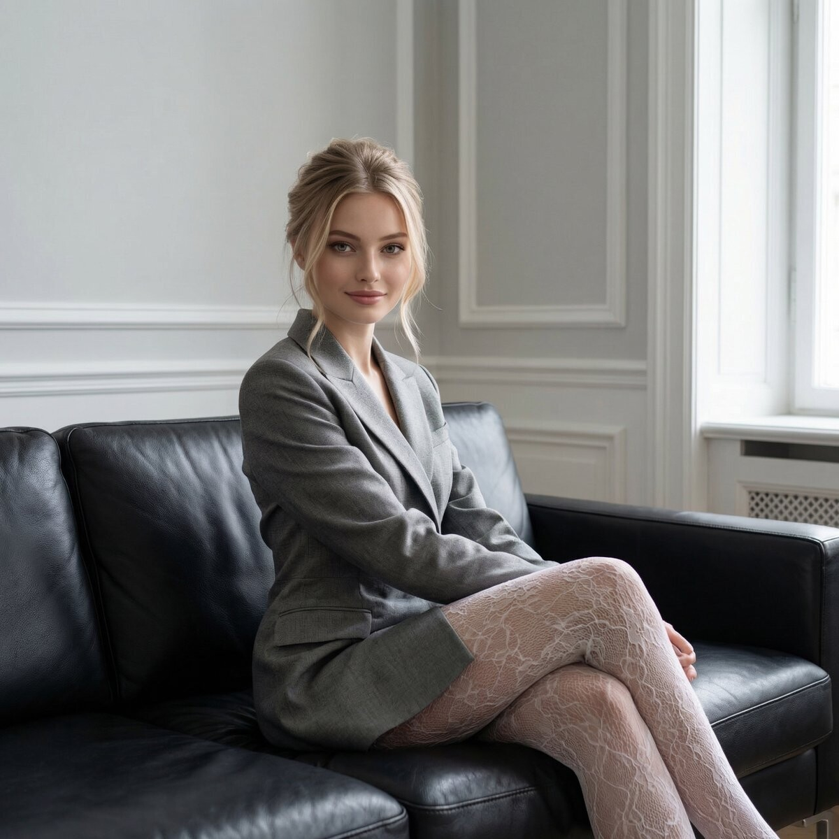 3. Professional studio portrait of a woman in white shirt, soft key light and fill light, clean background, high resolution, detailed skin pores, slightly messy bun, serious look, shot on Sony A7IV, 85mm lens