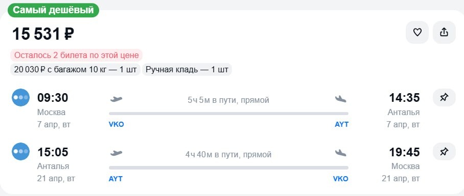 🇹🇷 Анталья за 15500 рублей 7 апреля - 21 апреля https://aviasales.tpo.li/xMyQigJ7 🇹🇷 Аланья за 20200 рублей 7 апреля - 21 апреля https://aviasales.tpo.li/AkYkrL32