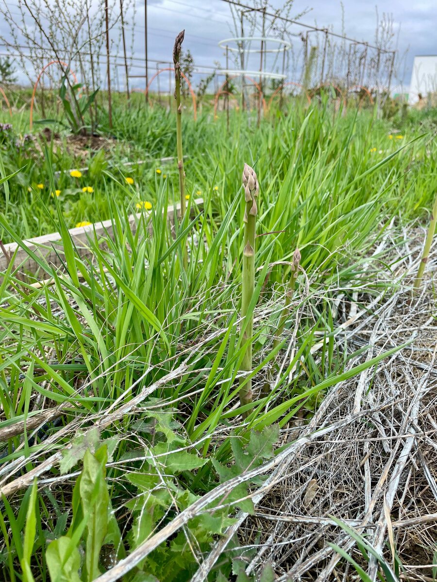 Всего-то прошло 3 года, как я посадил семена спаржи, и вот мы приехали на хозяйство, а тут первая еда выросла. В начале апреля, без теплицы, класс. Никогда не ел свежую спаржу, в рестиках обычно она подпеченная на гриле с разными соусами. Это очень вкусно, как молодой зеленый горошек, только сочнее. Но вырастить её до первого урожая оказалось довольно долгой задачей. Теперь думаю ещё одну грядку с ней сделать. Пару дней отдохнем от ремонта, продолжаю сажать изгородь в северной части участка. Пока травой всё не заросло, дотяну полив. Трава уже см 20. Виноград досажу в ряды.