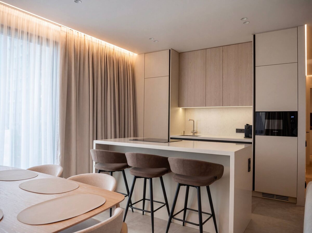 ». ⚪️ Спокойная палитра и сочетание фактур создают мягкое, многослойное пространство. Остров берет на себя основной функционал, сохраняя интерьер легким и открытым. В его объем интегрированы варочная поверхность, духовой шкаф, винный модуль и зона для сервировки. Логика хранения и техника подчинены правилам эргономики. ➡️ Кухня реализована в рамках проекта комплексной меблировки. _______________ Получить онлайн консультацию Рассчитать стоимость проекта Записаться в салон #жкметрополия #кухня